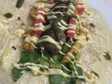 Tender grilled chicken kebabs wrapped in soft flatbread with crisp lettuce, tangy pickles, golden fries, and a flavorful house sauce. A delicious blend of smoky, savory, and fresh flavors in every bite.